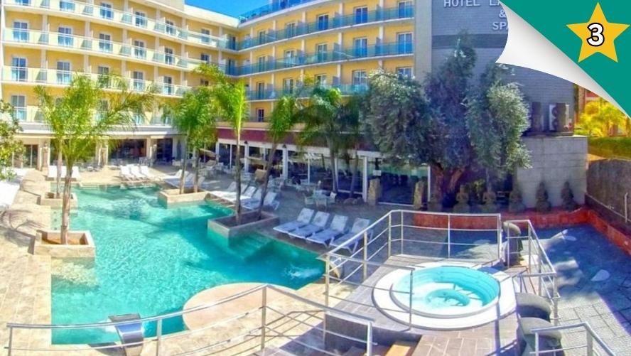 Hotel La Palmera & Spa is a centrally located, Hindu/Buddhist-inspired hotel in Lloret de Mar, Costa Brava, offering modern rooms and extensive spa facilities like Turkish/Finnish saunas, hot tubs, and an outdoor pool with waterfalls, making it a convenient base for exploring the beach, shops, and nightlife